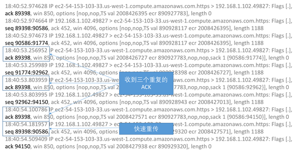 假设本机向服务器按顺序发了三个包,但是这三个包可能并没有按顺序到达,有可能第三个包先到了,这个时候服务器收到了乱序的数据,于是它马上产生一个重复的ACK,要求重新获取从第一个包开始的数据。收到重复ACK时,不应该马上进行重传,因为可能很快乱序的另外两个又及时到了。但是当收到三个重复的ACK时就可以认为那个包已经丢了,需要进行重传,不用等到超时,这个就叫做快速重传。如下图所示:&amp;amp;lt;img data-rawwidth="2682" data-rawheight="1360" src="https://pic1.zhimg.com/v2-bdbb31bcc60ed7a180e8602bb5f9cdc4_b.png" class="origin_image zh-lightbox-thumb" width="2682" data-original="https://pic1.zhimg.com/v2-bdbb31bcc60ed7a180e8602bb5f9cdc4_r.png"&amp;amp;gt;