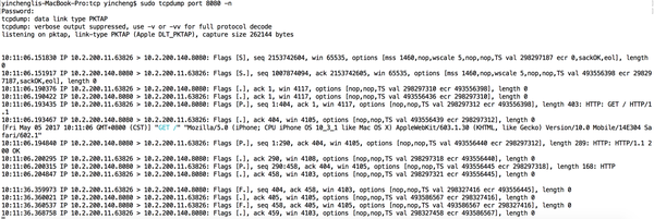 (4)用手机访问:http://10.2.200.140.8080,tcpdump就会打出所有传输的tcp包,如下图所示。<img data-rawwidth="1500" data-rawheight="502" src="https://pic4.zhimg.com/v2-e803186ced508e69efd1473aac82ead7_b.png" class="origin_image zh-lightbox-thumb" width="1500" data-original="https://pic4.zhimg.com/v2-e803186ced508e69efd1473aac82ead7_r.png">