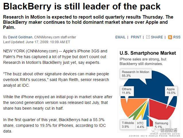 2009年,黑莓手机还曾占据美国50%以上市场份额(参考下图)。