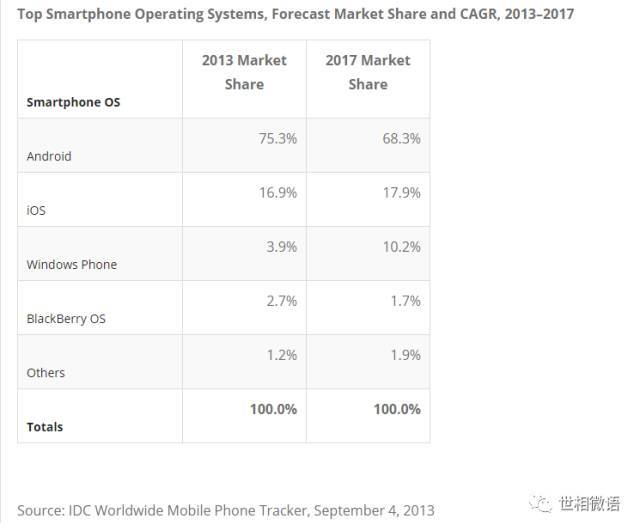 根据IDC报道,Windows Phone的市场份额在2013年曾达到3.9%(参考下图,2017年是预测数据)。