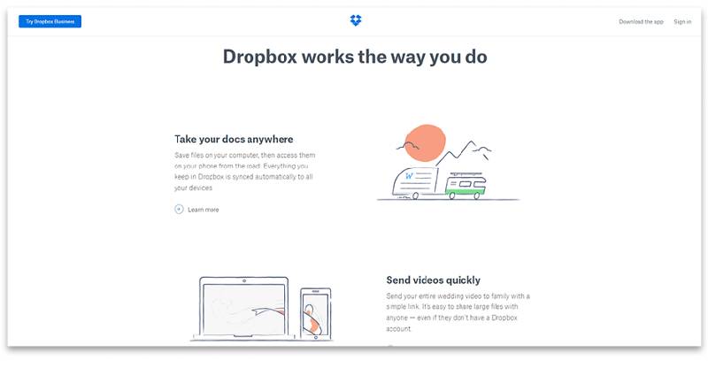小贴士:Dropbox是一个著名的品牌,该公司目前主要致力于推广他们新的文档创建工具Paper 。Paper的主页被分割成三个色块,分别代表的产品的三个不同部分:业务解决方案,文档工具和经典应用。简约、清晰的设计与Dropbox的其他品牌相一致,但功能强大到独树一帜。