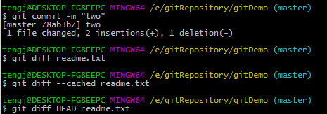 3.此时a,b,c都只有one,修改一下,添加内容two,执行git add readme.txt和git commit -m "two".再修改一次readme.txt,添加内容three,然后会执行git add readme.txt,此时a跟b都包含three,而c只包含one跟two。执行git checkout HEAD readme.txt后,c覆盖a和b,a,b里面内容都只有one跟two。分别使用命令git diff --cached和git diff HEAD来查看b跟c,a跟c的比对,发现都一样。