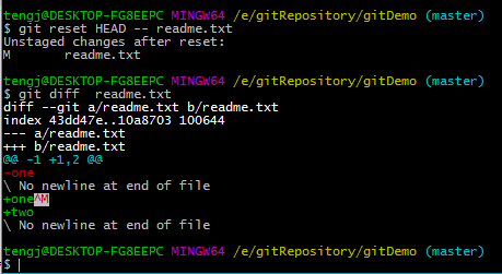 执行git reset HEAD -- readme.txt命令后,c覆盖b,这时候b内容也变成只有one了,使用git diff readme.txt命令可以看到,有内容修改,a跟b内容不一样。