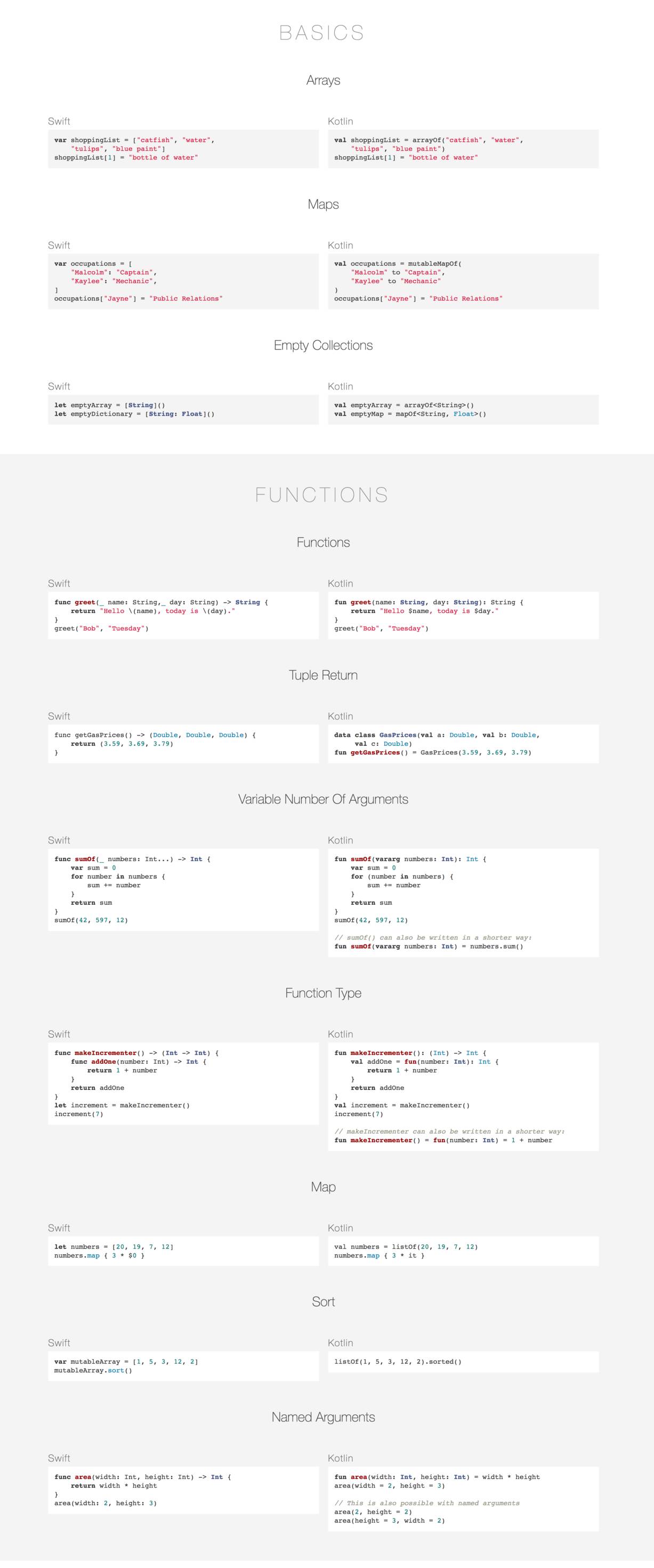 看到这里,相信你已经大概能理解,为什么那么多人把这两个语言放在一起讨论了的。如果你之前写过 Swift ,那么看完此图,分分钟就可以开启 IDE 写起 Kotlin代码, 反之亦然。