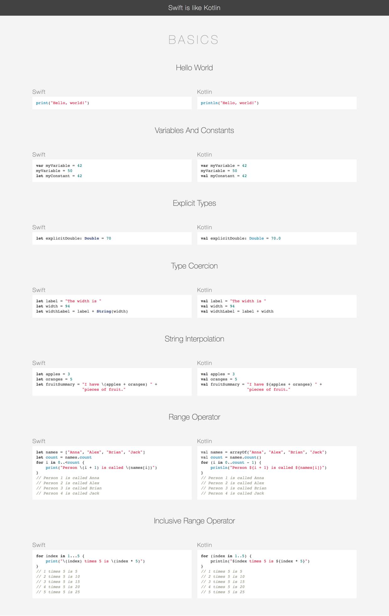 所以,楼主坚信语言仅仅是工程师的一把工具而已,用来在不同的平台上砍瓜切菜。楼主个人认为,你我都有学不完的语言,也很难做到拍着胸脯说自己完全掌握了什么什么语言,但作为拿工具的我们,可以做到的是,掌握拿工具的姿势,在不同平台环境下只是选择更加合适的工具,去拿刀(Swift)还是拿斧头(Kotlin)而已。语言是用来驾驭的,千万不要被语言牵着鼻子走。(所以前言里面说的 这篇文章适合已经学过其中一门语言,不仅仅局限与Swift & Kotlin)
