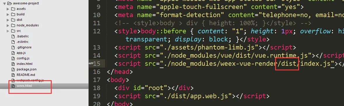 GET http://localhost:8080/node_modules/weex-vue-render/index.js 404 (Not Found)这个文件是来模拟手机端的文件,很明显这个路径错误的,导致我们上面看到的是空白的手机页面,所以,我们在/weex.html里面修改weex-vue-render/index.js的路径