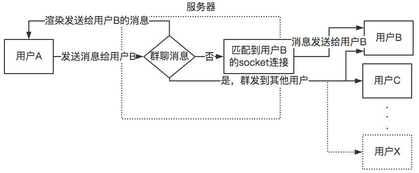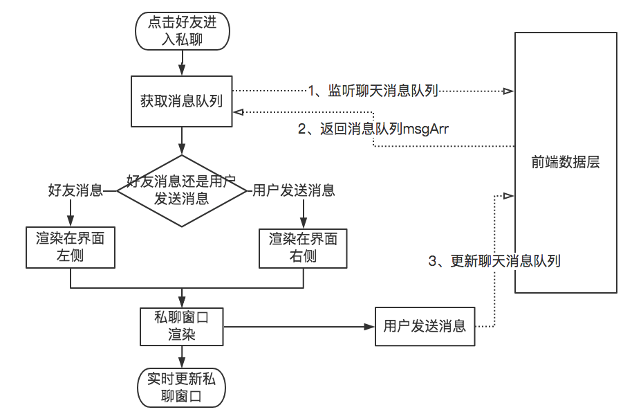 可以看到在CHAT.msgArr维护了一个公共消息队列,这个队列里面有群聊也有私聊的消息。同时每一个数组对象里面都含有fromUSer,toUser方法,来作为记录发送消息的人和接受消息的人的区分。再配合路由中携带的用户名来判断该消息应该渲染在界面的左侧还是右侧。同时由于群聊中虽然用户所面对的聊天对象是“群聊”,但是在渲染左侧“群聊”发送的消息时,仍然应该渲染出真实的用户名即msgObj.trueFrom字段。