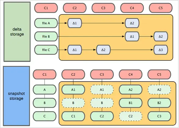 我们思考一下,版本控制系统应该如何记录每次提交呢?正常的思维肯定是记录“差异”(delta),也就是前后两个版本中文件内容的不同,确实大多数版本控制系统是这么做的,比如我们所熟悉的CVS,SVN。但是,Git却不这样!每次提交更新时,Git会对全部文件作一个快照(snapshot),并保存指向这次快照的索引。