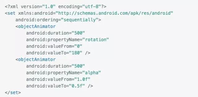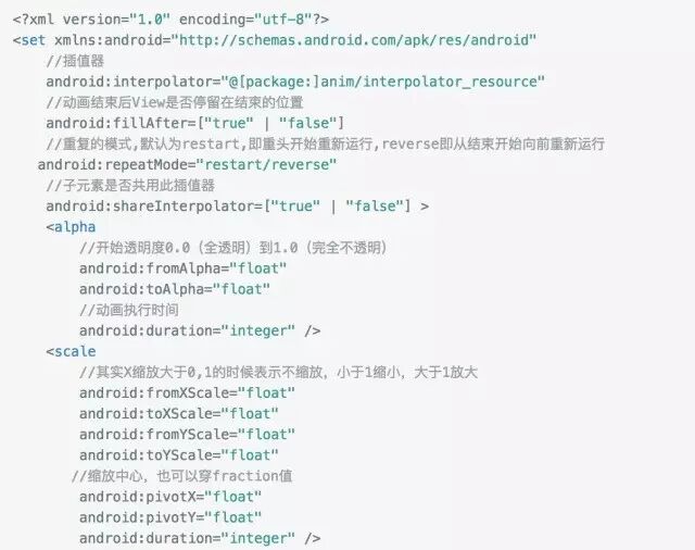 上面的监听分别是动画开始结束和更新时候的回调。我们在回调中做一些额外的操作。在代码中实现动画就不在细说,主要对应AnimationSet, TranslateAnimation,ScaleAnimation,AlphaAnimation,RotateAnimation。