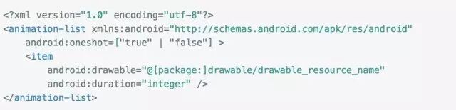 看了上面你会发现实现Frame动画很简单,属性很少,animation-list 是动画的根元素,在根元素中的oneshot属性表示动画执行次数,如果设置为true表示只播放一次,如果false则表示会一直循环执行。在根元素下有item元素,该元素就是我们要添加的图片,每一个item表示一帧,item下的drawable就是我们的图片资源,duration就是该帧动画执行的时间。例如