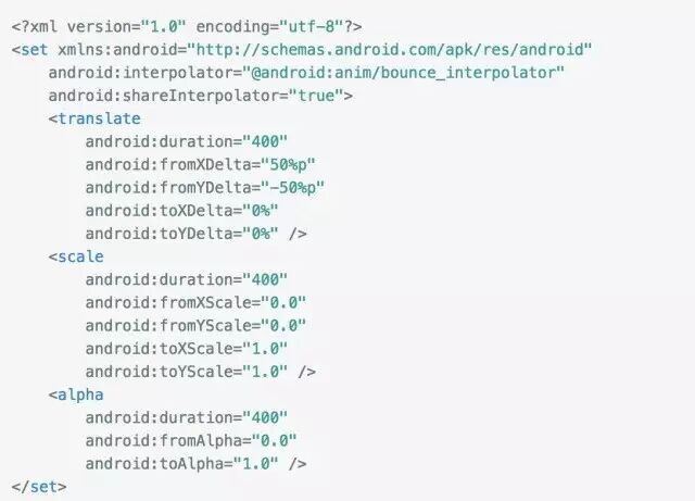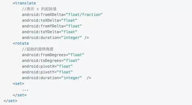 这是官方给的语法,set 是一个动画集合,内部可以是多个动画的组合,也可以嵌套set,这里包含了动画实现的所有属性。在上面的语法中我们需要注意的是平移的时候其实位置接受百分比数值:从-100到100的值,以“%”结尾,表示百分比相对于自身;从-100到100的值,以“%p”结尾,表示百分比相对于父容器。例如平移开始位置在自身中间则是50%,如平时开始位置在父容器的则是50%p.