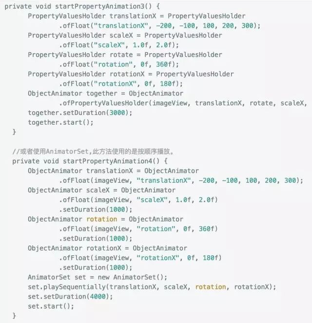 在上面代码实现了一直属性动画,那么如果我们想同时作用几个属性那该如何操作呢。此时我们有两种实现方式分别是类PropertyValuesHolder和AnimatorSet,话不多说,先上图再直接上代码。