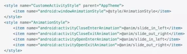 同理Fragment也可相应设置,如activityCloseEnterAnimation改为fragmentCloseEnterAnimation即可。除此之外我们也可以使用windowAnimation,它包括 windowEnterAnimation 和 windowExitAnimation。注意的一点就是WindowAnimation的控制权大于Activity/Fragment Animation的控制权。