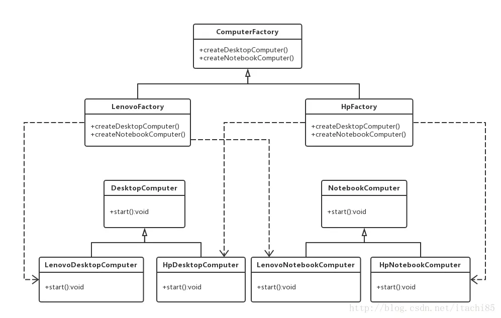 }两个抽象产品类分别为DesktopComputer和NotebookComputer ,用来定义两个产品线:台式机和笔记本。它们都定义了start方法,用来启动电脑。