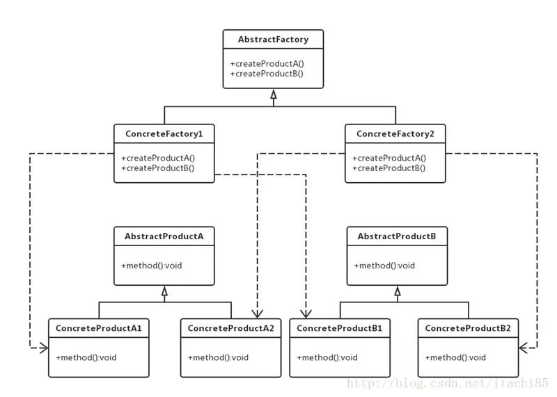 - AbstractFactory:抽象工厂,它声明了用来创建不同产品的方法。