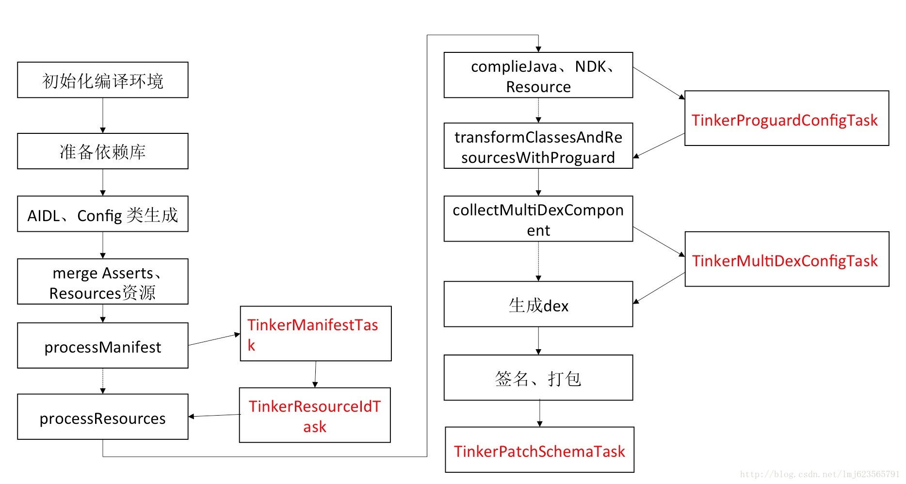 - 当项目比较大的时候,我们可能会遇到方法数超过65535的问题,我们很多时候会通过分包解决,这样就有主dex和其他dex的概念。集成了tinker之后,在应用的Application启动时会非常早的就去做tinker的load操作,所以就决定了load相关的类必须在主dex中。