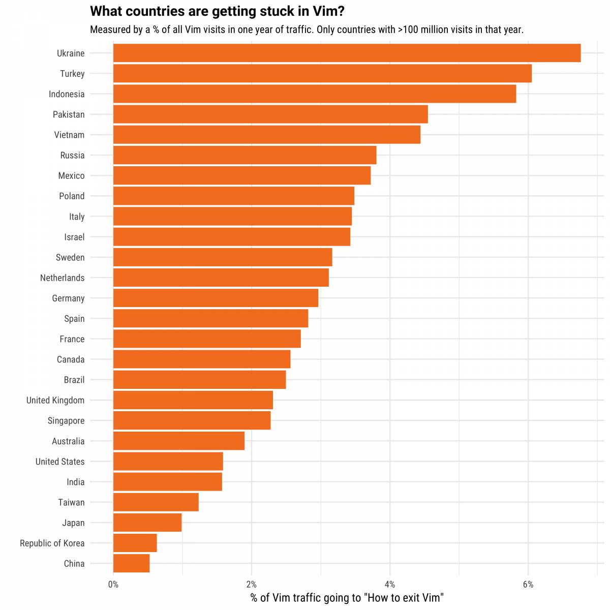 数据表明,乌克兰、土耳其和印度尼西亚的开发者最常卡在 Vim 里,而日本、韩国、中国的开发者则比较少被这个问题困扰。