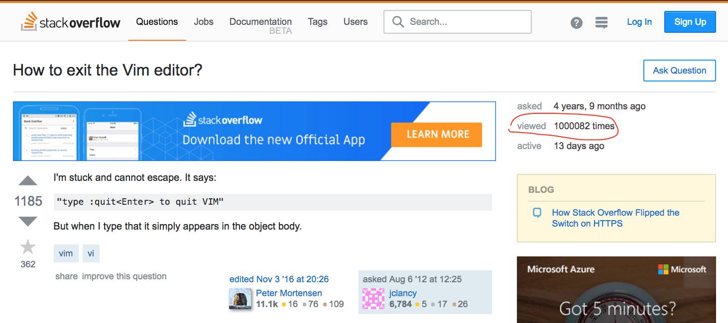 去年一整年,How to exit the Vim editor 占了整站问题流量的 0.005%,每 2w 个来到 Stack Overflow 的用户中,就有一人是来找这个问题的。这意味着,在流量最高峰的时候,每小时有超过 80 人来 Stack Overflow 上寻找如何退出 Vim 的答案。