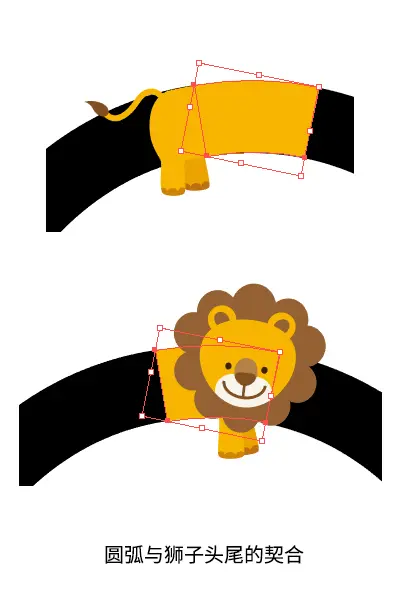 为了保证狮子身体拉伸时与头部和尾巴实现无缝对接,要对小狮子进行一些小改造,把圆弧的一段嵌入到身体中。