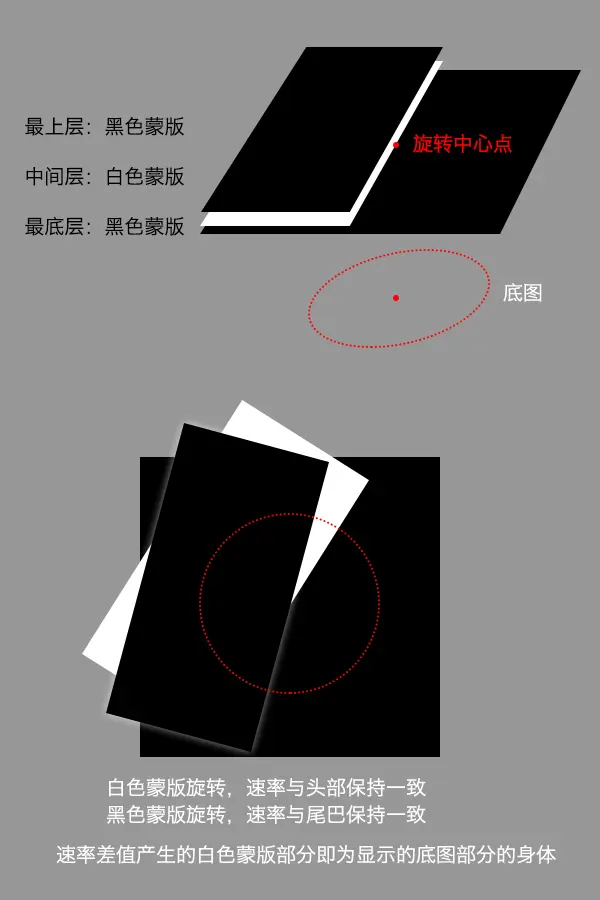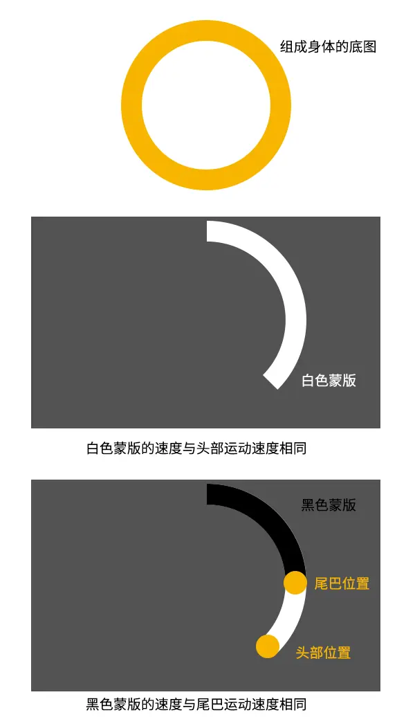 首先我把一圈的身体做为底图,然后利用蒙版(不了解SVG蒙版动画的小伙伴先看一下我的关于SVG蒙版动画的文章)来实现。蒙版上分别画两条路径,一条是白色,为了露出身体底图部分,运动速率与头部保持一致,同时,一条为黑色,运动速率落后于白色,为了消除掉多余的身体部分,运动速率与尾巴保持一致。形象一点来说,就是白色描边蒙版在前面跑,后面黑色描边蒙版在追赶,直到完成一个周期的运动。
