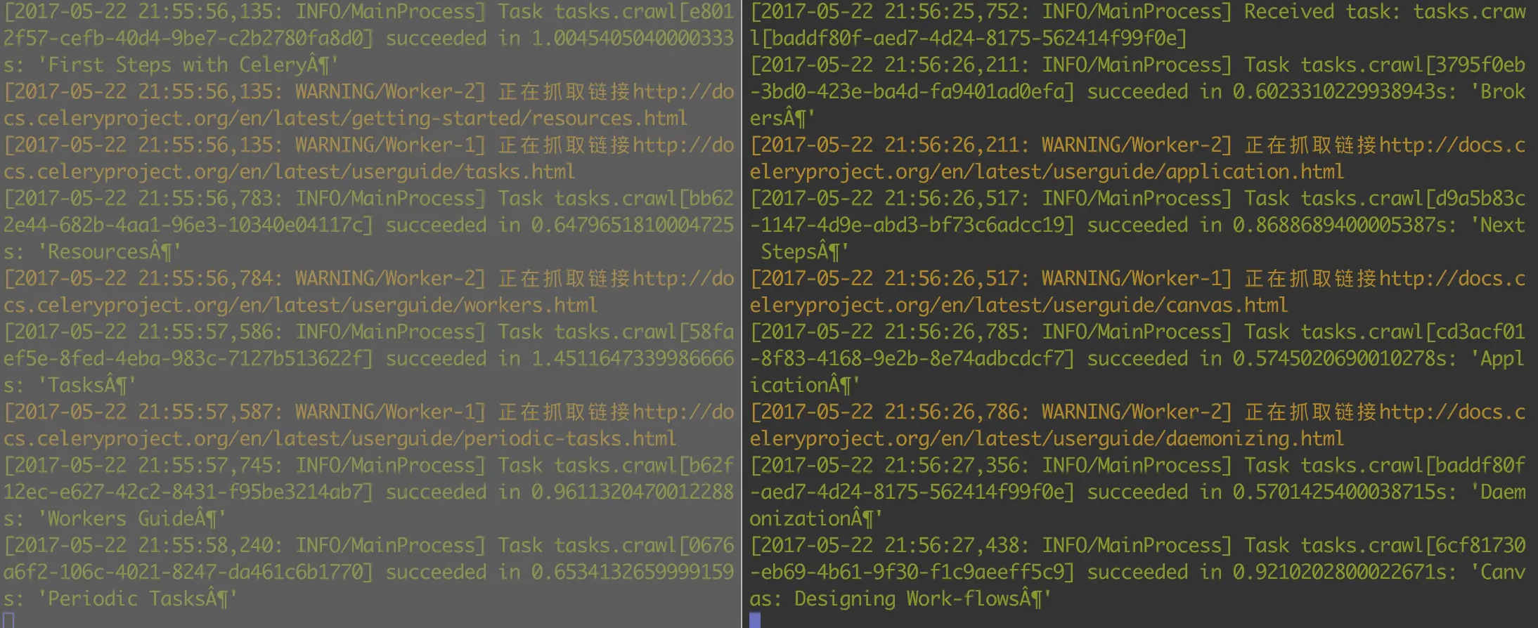 这个时候,我们运行给这两个worker节点发送抓取任务