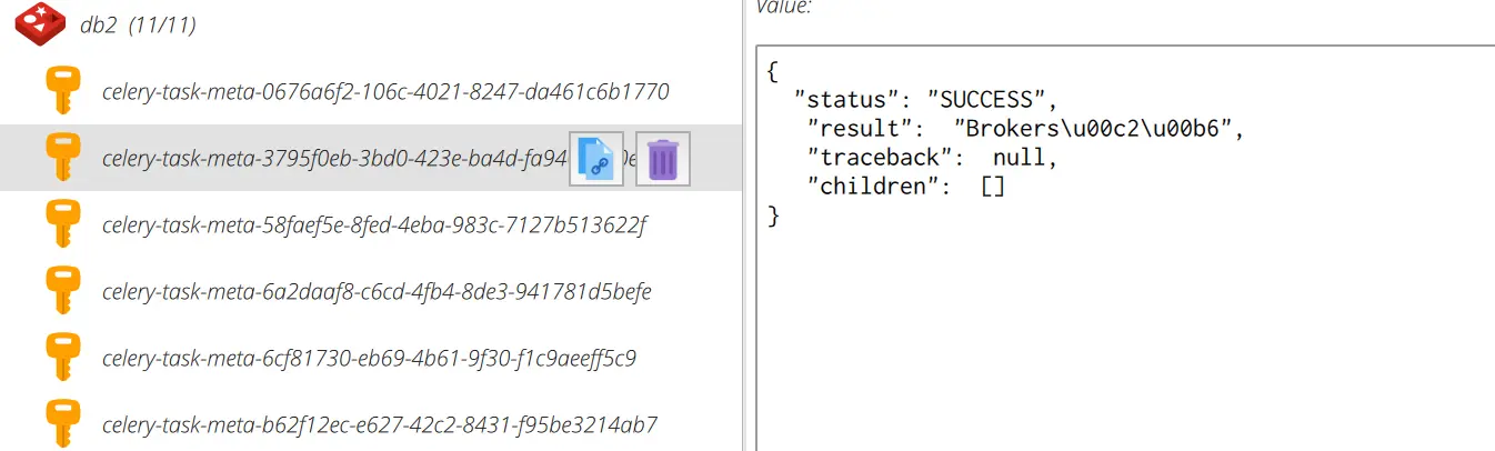 可以看到一共有11条结果,说明 tasks.crawl中返回的数据都在db2(backend)中了,并且以json的形式存储了起来,除了返回的结果,还有执行是否成功等信息。