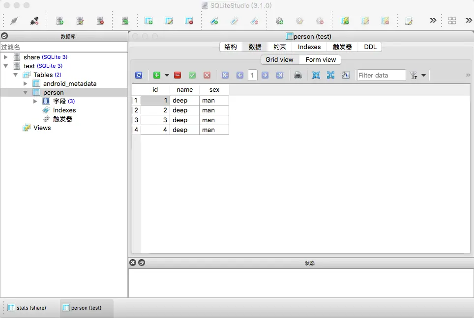 我们可以借助一些pc上的工具查看数据库的表结构。例如SQLiteStudio,当然还有其它软件,这里不再做介绍。