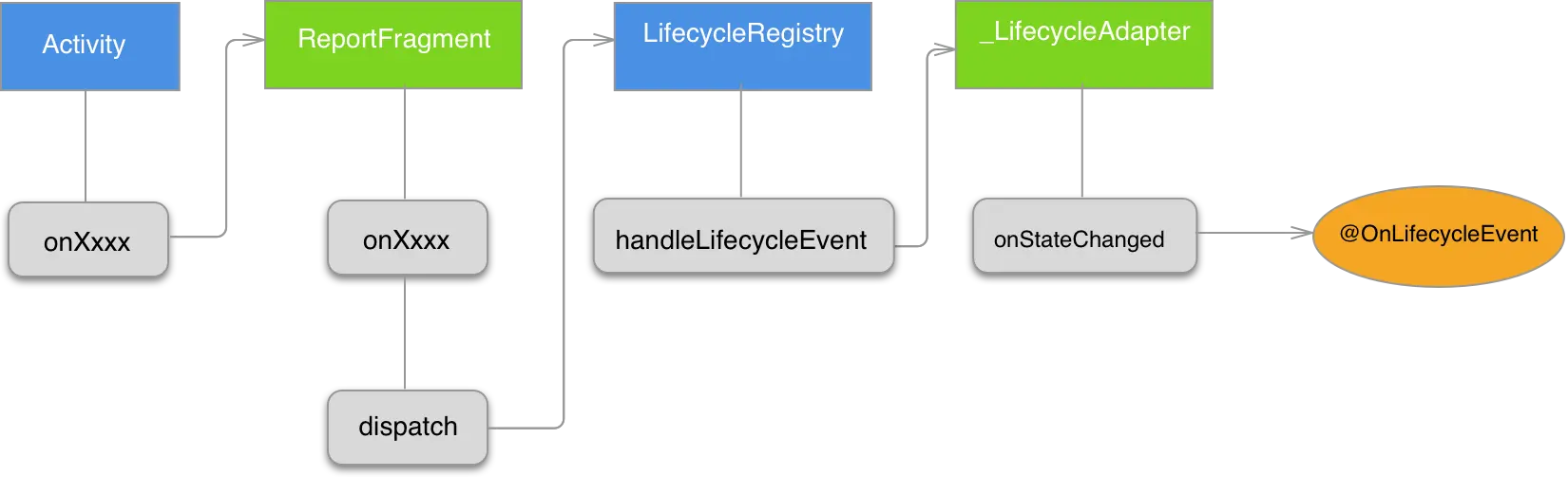 Activity 不用写任何代码,那么 Lifecycle 是如何把 Activity 生命周期事件传递给 LifecycleObserver?最终通过研读 Lifecycle 的代码,发现里面有个包可见的类 LifecycleDispatcher,LifecycleDispatcher 是一个单例,在 LifecycleDispatcher#init(Context) 中,它通过 registerActivityLifecycleCallbacks 方法,向当前的 Application 注册一个 DispatcherActivityCallback,但 Lifecycle 并没使用 ActivityLifecycleCallbacks 来监听并派发生命周期事件。