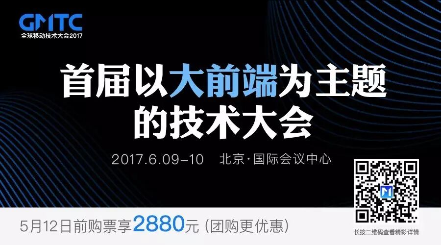 视野拓展InfoQ 主办的移动和前端开发领域的精品大会【GMTC 2017】将于 6 月 9~10 日在北京举行,作为首届以“大前端”为主题的大会,GMTC 涉及移动、前端、跨平台、AI 应用等多个技术领域,帮助你方方面面提高技术水平。扫描下图二维码,前往官网了解详细信息!