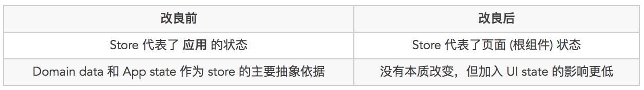 抽象问题:每个 Page 独立创建 store,解决状态树的一对多问题,一个状态树 (store) 对应一个组件树 (page),page 在设计 store 时 不用考虑其它页面,仅服务当前页。当然,由于 Reducer 仍然需要独立于组件树声明,抽象问题并没有根治,面向领域数据和 App state 的抽象仍然比 UI state 更自然。它仅仅带给你更大的自由度:不再担心有限的状态树如何设计才能满足近乎无限的 UI state。