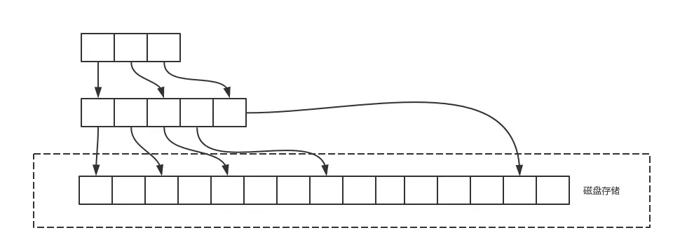 - 如果还需要继续优化的话,那么可以把上面几层的节点的数据项变成指针,都指向磁盘的偏移地址上,那么就更加的节省空间了,这样又牺牲了一部分检索性能,因为每一次读取一个节点,不管是不是底层节点,都需要读取一次磁盘来获得数据,对于上面两个优化方式,对应的数据结构的图如下,可以看到这样优化下去,内存的使用量会变得很小了。