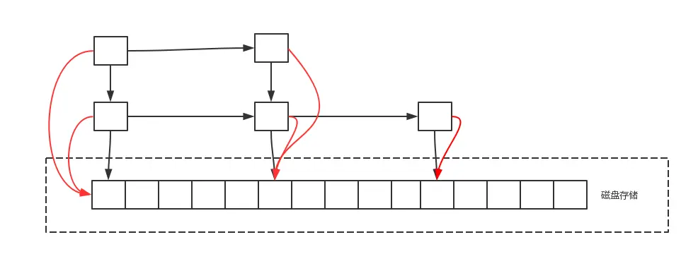 - 如果我们的内存空间不够或者说跳跃表存储的序列太长了,那么我们可以把跳跃表的最底层的链表存储在磁盘上,这是一次优化情况,那么检索的时候需要一次到多次磁盘才能检索到数据,相当于用一部分性能来获得更大的数据加载能力。