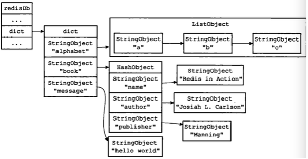 代码中有个dict,这个字典(键空间)存放了数据库所有的键值对,它的键是字符串对象,值可以使Redis的5中任意对象之一.下面给出一个它的实例图(redis设计与实现p94)