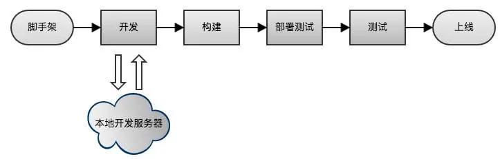 在讨论实现一个脚手架要考虑哪些要素之前,我们不妨先看看脚手架的执行环境。回顾前文提到的简易前端工作流,最简单的情形是:框架提供一套完整的本地工具链,脚手架、开发、开发服务器、构建和部署测试都是在本地环境执行,如下图: