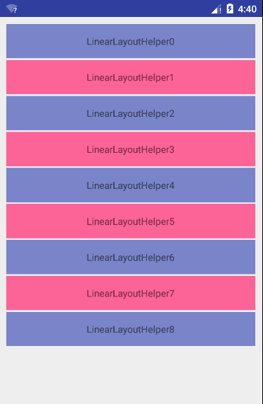 - LinearLayoutHelper: 线性布局,就是实现ListView的效果很简单,直接看代码: