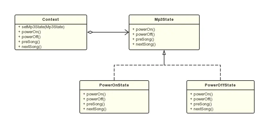 }Context 中定义了setMp3State方法,用来设定状态,其中powerOn方法中会调用setMp3State方法将状态置为PowerOffState,同理powerOff中将状态置为PowerOffState。