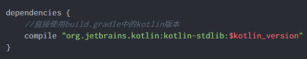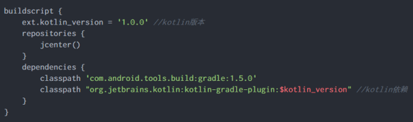 这样就会在项目构建时添加Kotlin Gradle插件。请注意上面在ext.kotlin_version中标注的kotlin版本字符串,我们一会还要在app模块的compile dependencies中用到它,而且两个地方版本必须相符。你最好使用官方文档中最新版本。