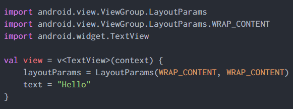 type-safe builders的一个典型用法就是构建嵌套式数据结构,比如XML。在Android中有很多XML文件,如layouts和views。如果Kotlin可以以程序的方式动态编写XML,它可能很善于处理层级问题。所以我决定尝试使用Kotlin创建一个动态构建View层级的工具。如果是在Java中做这件事,代码量之大可以想象。