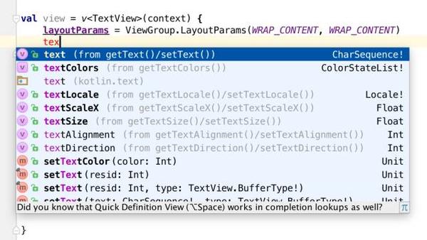 lambda with receiver的一个语法特色就是当操作this的方法或属性时this关键字可以省略。但在上面的调用例子中layoutParams和text到底是什么?其实这些属性是Kotlin提供的receiver类型(TV)的属性。因为TextView有setLayoutParams()与setText()等方法,Kotlin会自动识别这些JavaBean风格的方法并为他们创建属性,好像它们是类的成员变量一样。所以这里text = "Hello"等价于this.setText("Hello")。下面是在安装了Kotlin插件的Android Studio中的截图,里面展示了自动完成的内容。