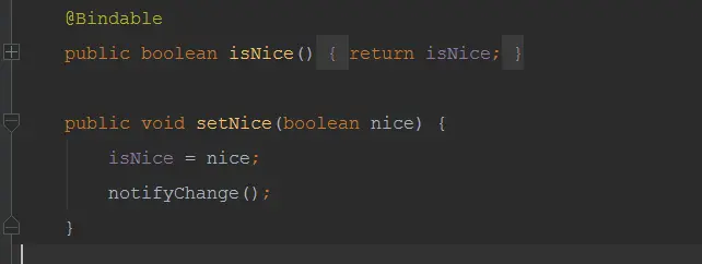 isNice方法添加了Bindable 注释 并且 setNice方法里边调用了notifyChange()方法 。这样就实现了双向绑定 数据改变UI改变 UI改变数据也随之改变的逻辑~~ 。(还有其他的方式 我就不赘述了,请看google文档,前面已经给了传送门)。