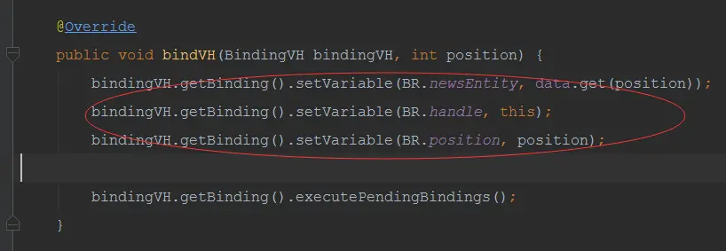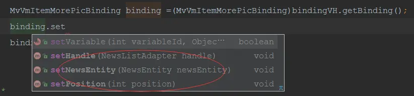 variable 标签中 name属性的值是你随意定义的(前提是你要知道定义这个名字的意义) type属性就是我们需要导入的包了~ 比如我们用到了 NewsEntity这个实体类 我们就需要导入这个包,可以这个实体是怎么设置进来的呢? 我们来看adapter中的bindVH方法