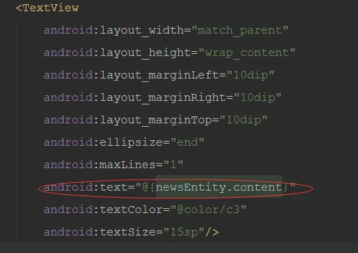 所有xml中无论是事件绑定还是数据绑定都要这种格式@{...}因为我们已经设置了newsEntity 所以在我画圈的地方可以直接使用