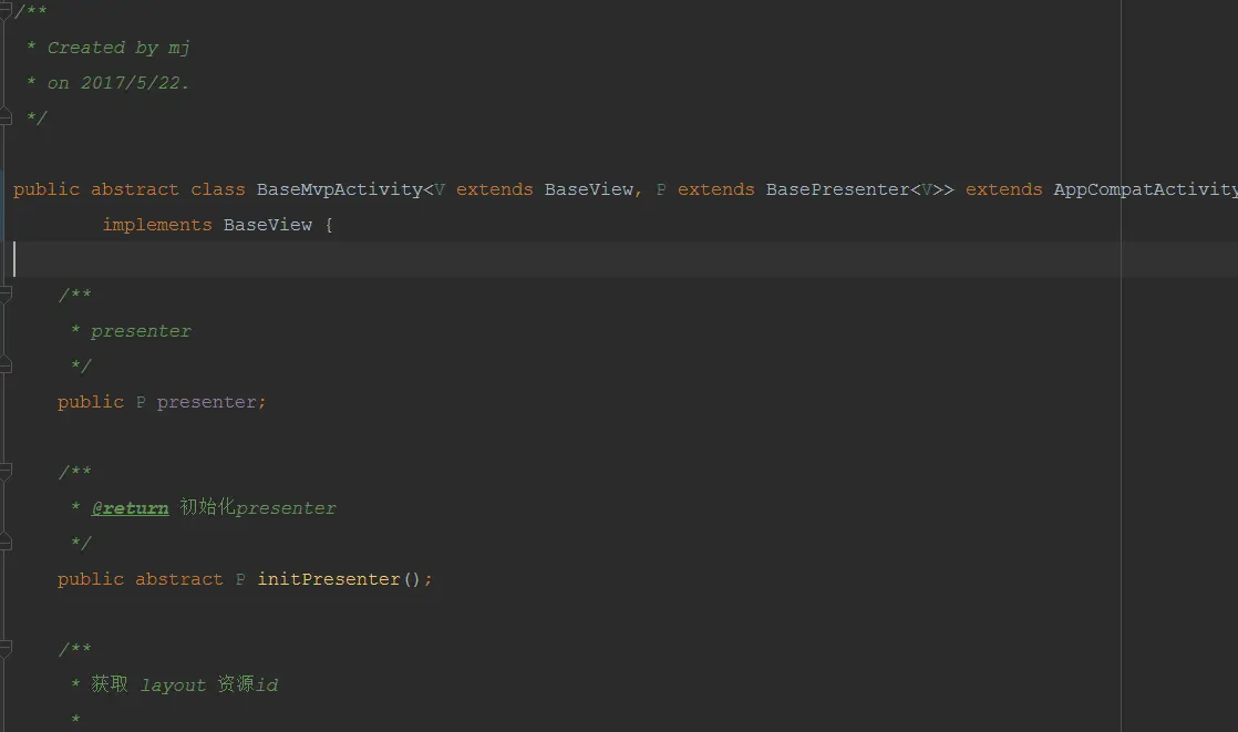 在mvp中我们依然通过泛型来指定IView接口 与 Presenter 的类型(方便在presenter中绑定Activity或Fragment的生命周期),presenter方便做attach 与 detach的操作。