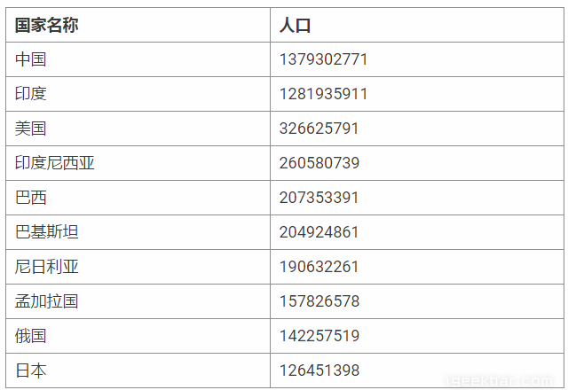 虽然这个表里只有10个国家,不出意料的话,我猜你大概也会直接忽略掉它。。。。正常情况下,人们只会看一两个他们感兴趣的国家。但是如果这张表被转换为柱状图的话,人们看一眼就会得到有关人口数量分布的大致信息。