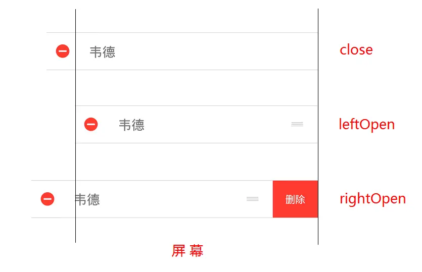 当结束编辑状态时,就将控件的宽度复原。我们需要先将宽度复原,再让它滑动到关闭的状态。这里会有两种情况,左边展开关闭和右边展开关闭。关闭时会调用 close() 方法,我们在这里做处理: