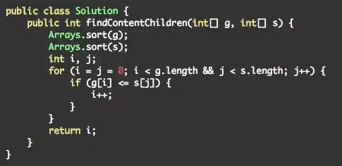 将g与s都从小到大排列,再用两根指针i,j,如果g(i)<=s(j),则将s(j)分配给g(i),再看下一个孩子与下一块饼干,i与j均自增;否则,应依次增大j去寻找能满足g(i)的s(j)。这种方法叫做two pointer。设孩子数与饼干数的较大值为n,则排序的时间复杂度为O(nlog(n)),两根指针的时间的复杂度为O(n),总的时间复杂度为O(nlog(n))。