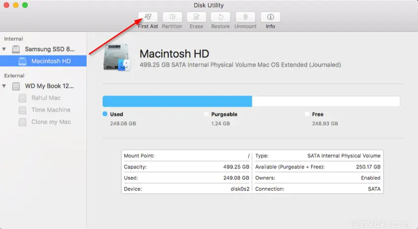 从侧栏选择启动,然后单击工具栏上的“ 急救 ”按钮。当你单击 运行时,磁盘工具将验证光盘,并尝试在必要时进行修复。