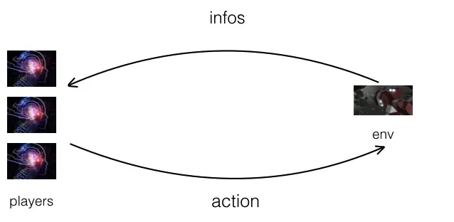 上面给出了深拷贝效率对比的结果,已经可以看出深拷贝很慢了,但没有办法直观感受深拷贝拖累整个程序的运行速度。下面给一个实际项目的例子,最近在写的一些游戏环境。玩家程序获得游戏环境给出的信息,当前玩家程序选择合适的动作,游戏环境根据该动作推进游戏逻辑;重复上述过程,直到分出胜负;整个过程如下所示。给玩家程序的信息必须从游戏环境深拷贝出来。如果给玩家的信息是从游戏环境浅拷贝出来的,那么玩家程序有可能通过信息获取游戏秘密或者操纵游戏。