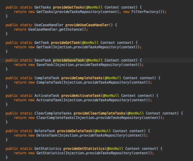 然后InJection.java里面提供了一堆的useCase的对象的静态方法provideXXX