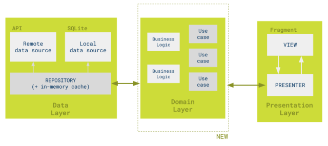 我们可以看到它比基本的MVP架构其中添加了一层新的Domain Layer层。